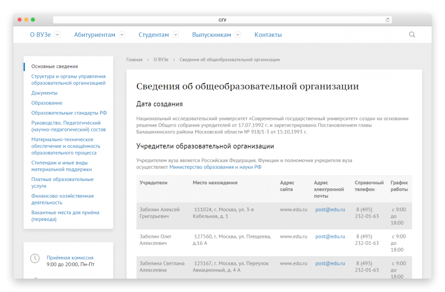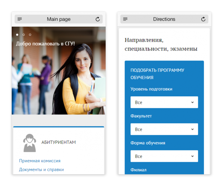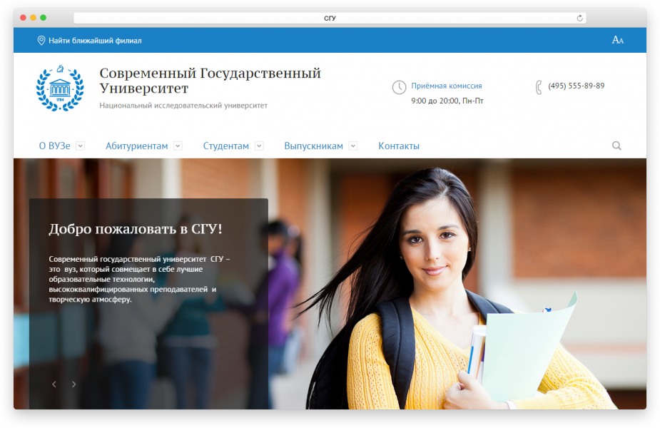 Сайт полностью готов: реализован дизайн, структура, созданы все готовые разделы: «О вузе», «Абитуриентам», «Студентам», «Выпускникам» с демонстрационным контентом.