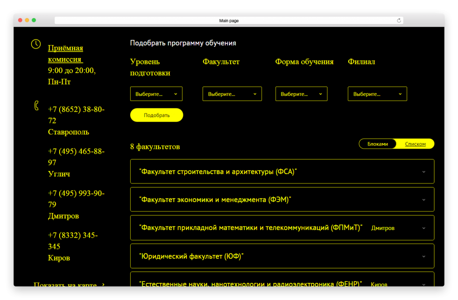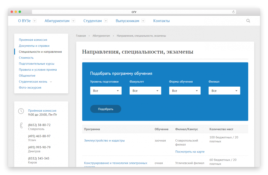 Чтобы облегчить абитуриенту выбор образовательной программы, в решение включен настраиваемый фильтр. Достаточно задать факультет, и будет доступна подробная информация о специальности, сроке обучения, дисциплинам, по которым нужно сдать экзамены, и т.д.