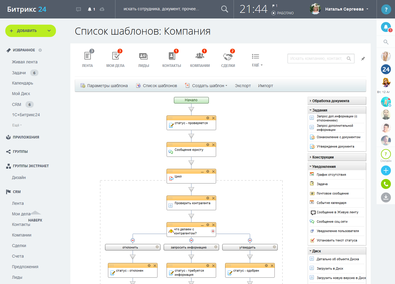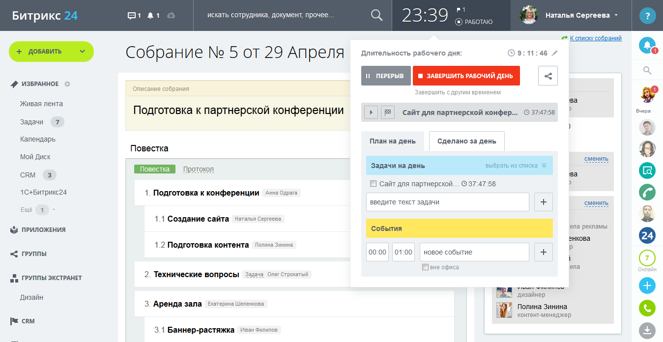 Облачный сервис для большой компании, позволяющий автоматизировать внутренние бизнес-процессы, например, документооборот. Тариф включает систему учета рабочего времени, формирующей отчеты по рабочему времени для каждого сотрудника и учитывающей затраты времени на выполнение задач. Вы можете автоматизировать свои собрания и планерки: рассылать автоматом приглашения, ставить в встречи в календари сотрудников, назначать задачи и отмечать выполненные в протоколе.Возможности